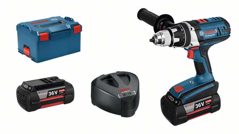 Аккумуляторная дрель-шуруповёрт GSR 36 VE-2-LI; Новая дрель-шуруповерт и ударная дрель 36 В! Самая мощная дрель-шуруповерт/ударная дрель в мире!; Огромная мощность: даже для последовательного заворачивания больших шурупов (8 x 280 мм) с крутящим моментом 100 Н·м в самых сложных материалах – без снижения скорости; Благодаря мощному 4-полюсному двигателю с редкоземельными магнитами и 4 угольными щетками, новые аккумуляторы в сочетании с новейшей электроникой обеспечивают повышенный постоянный и пиковый ток и, соответственно, увеличенную мощность; Увеличение продолжительности работы на одной зарядке аккумулятора более чем на 50 % благодаря новым аккумуляторам емкостью 4,0 А·ч и 2,0 А·ч с технологией Bosch COOLPACK (* по сравнению с существующими аккумуляторами 2,6 А·ч/1,3 А·ч); Дополнительная рукоятка (№ запасной части 2 609 199 583); Кейс L-BOXX 238 (1 600 A01 2G2); Зарядное устройство AL 3640 CV (2 607 225 100); 1/1 вкладыш для кейса L-BOXX под инструмент (1 600 A00 2WD); 1/2 вкладыша для кейса L-BOXX под зарядное устройство (2 608 438 112); 2 аккумулятора GBA 36V 4.0Ah (1 600 Z00 03C)