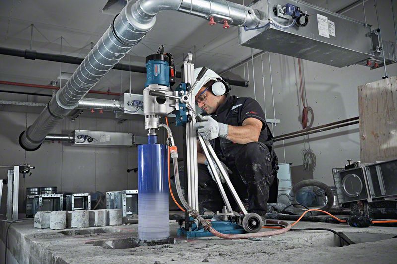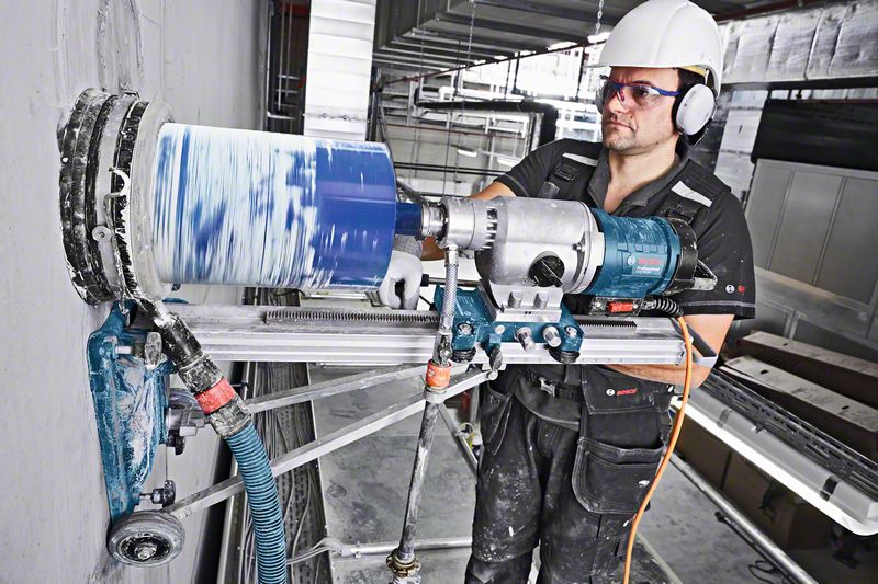 Дрель алмазного сверления GDB 350 WE; Превосходство в обработке бетона — изготовление проемов до 350 мм; Двигатель мощностью 3200 Вт и 3-скоростной редуктор для кернового сверления отверстий до 350 мм в армированном бетоне; Долгий срок службы благодаря прочной конструкции и редуктору со смазкой погружением; Сверление в комбинации со стойкой сверлильного станка GCR 350 (код для заказа 0 601 190 200)