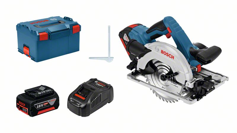 Аккумуляторная циркулярная пила GKS 18V-57 G; Беспроводной циркулярная пила для всех видов пропилов; Быстрые пропилы и продолжительная работа на одном заряде аккумулятора благодаря мощному двигателю и 5,0 А*ч аккумулятору ; Новый дизайн инструмента предусматривает расположение пильного диска с правой стороны; Великолепная точность пропилов, благодаря совместимой направляющей шине; 2 аккумулятора GBA 18V 5.0Ah (1 600 A00 2U5); Быстрозарядное устройство GAL 1880 CV (1 600 A00 B8G); Кейс L-BOXX 238 (1 600 A01 2G2); Вкладыш для кейса L-BOXX; 1 пильный диск, Standard for Wood, 165 x 1,7/1,2 x 20 мм, 36 (2 608 642 602); Переходник пылеотвода; Внутренний шестигранник; Параллельный упор